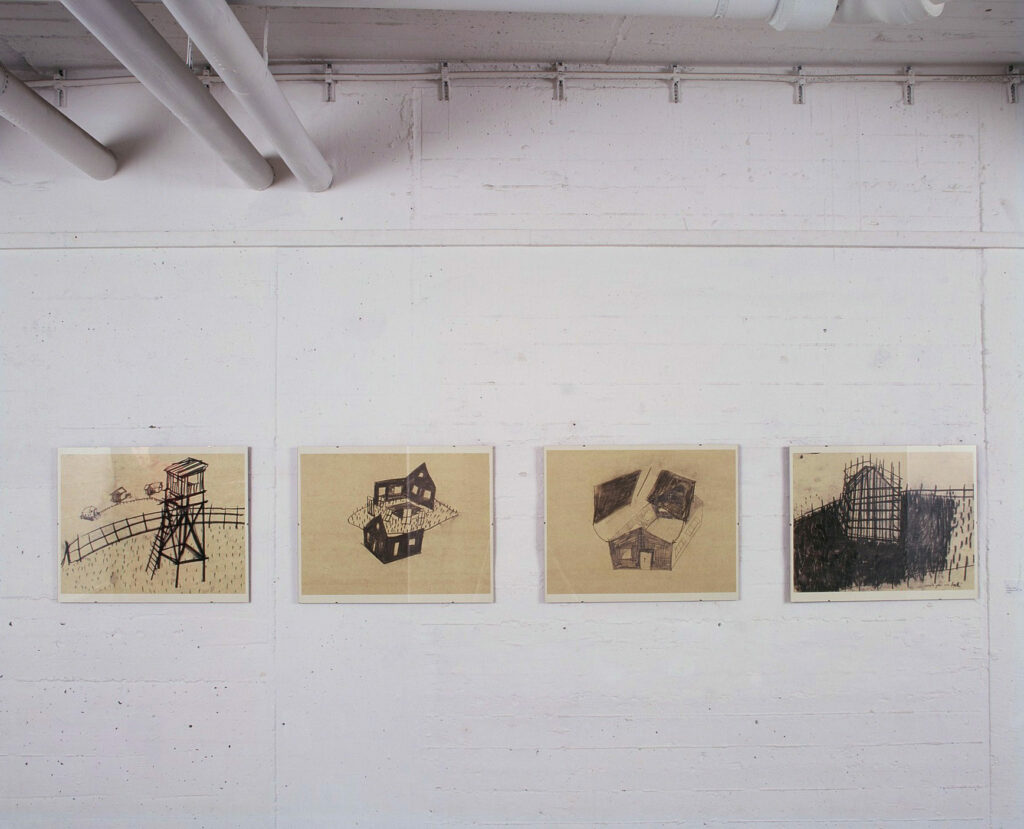 Großformatige gestische Kohlezeichnungen, Assemblagen, direkt auf die Wand montiert. Auf langen Zugfahrten zu meinen Eltern von Berlin nach Niederbayern, prägt sich mir die durch Hochspannungsleitungen, Ackerflächen, Zäune und Hochsitze rhytmisierte, vorbeigleitende Landschaft ein und ich bringe dies in großformatigen Zeichnungen zu Papier. Die kartographischen Darstellungen der Shaker Mitte des 19. Jahrhunders, sind meinen Arbeiten so ähnlich, dass ich einen Arbeitsaufenthalt bei der United Society of Shakers in Sabathday Lake, Main, U.S.A. organisiere.
